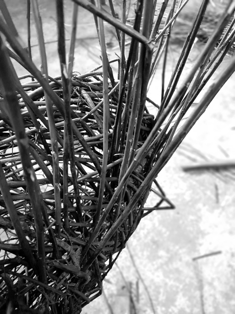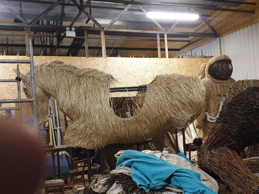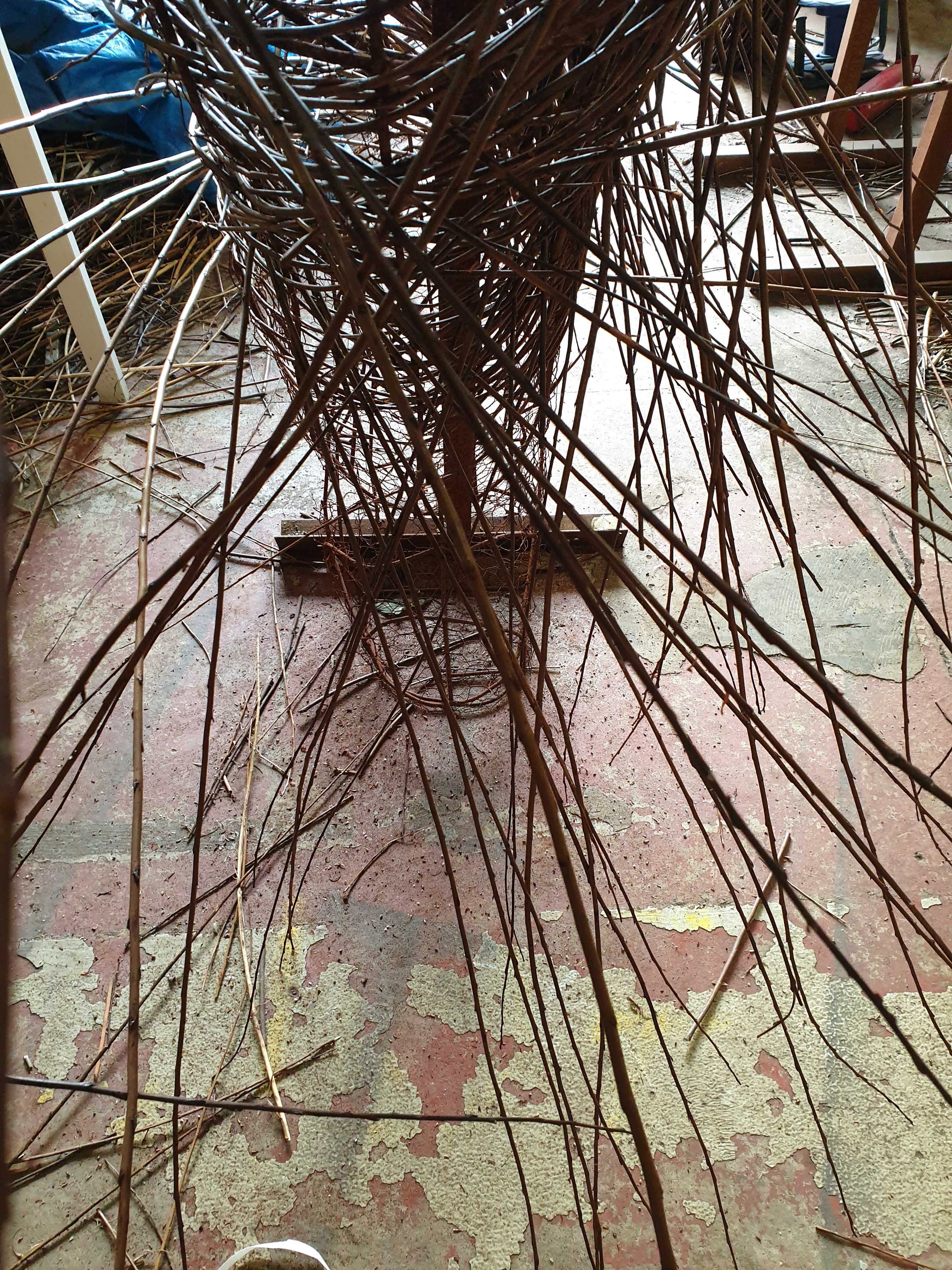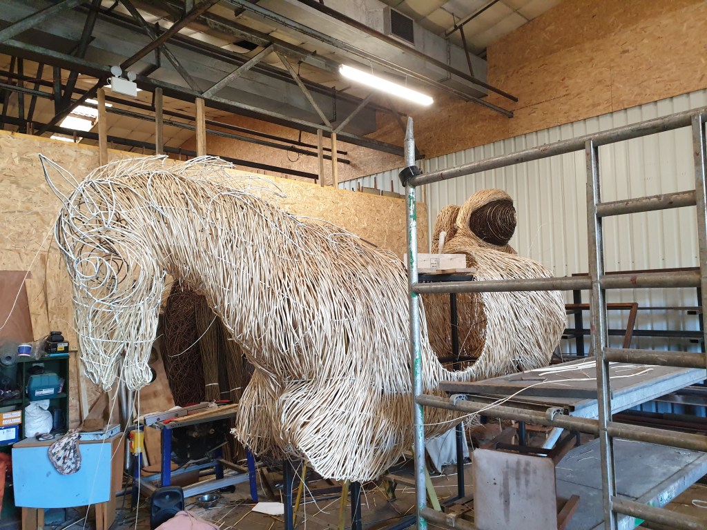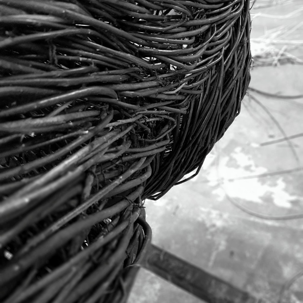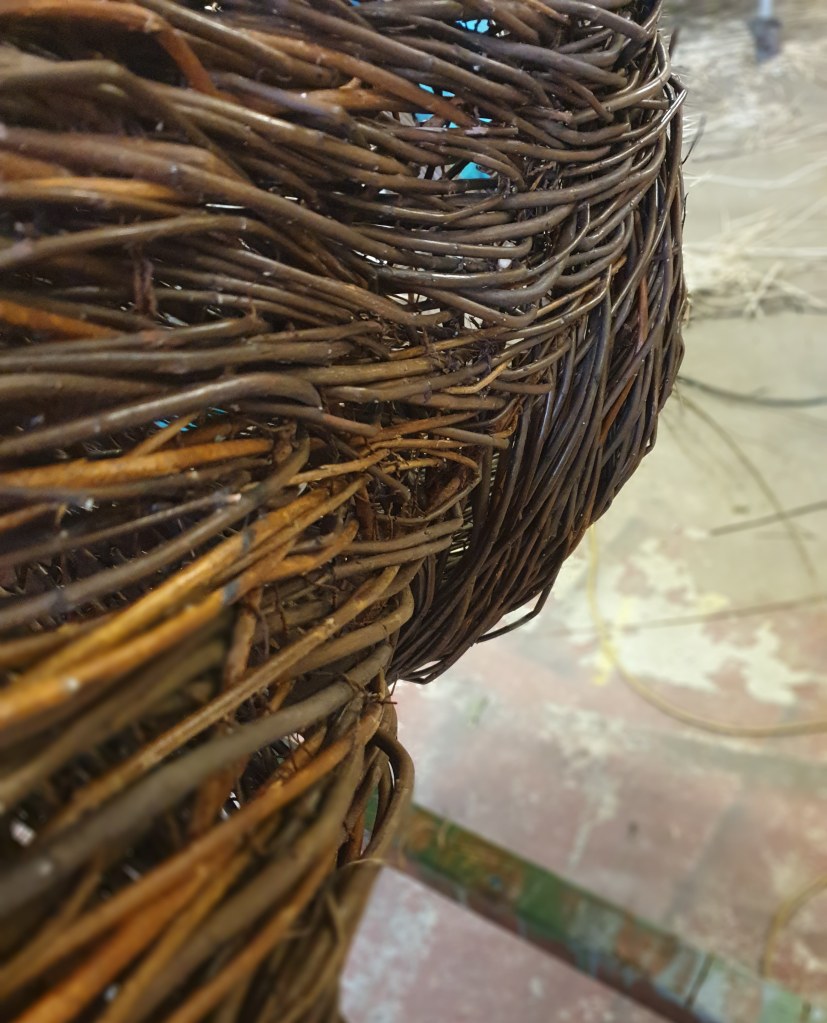 In, out and roundabout. Legs in the weave for the Poet Walking commissioned by the National Trust for Scotland destined for Alloway along with Tam and his trusty steed Meg. Two pieces on the go, 11 sections in all. And the water drops back to play with?