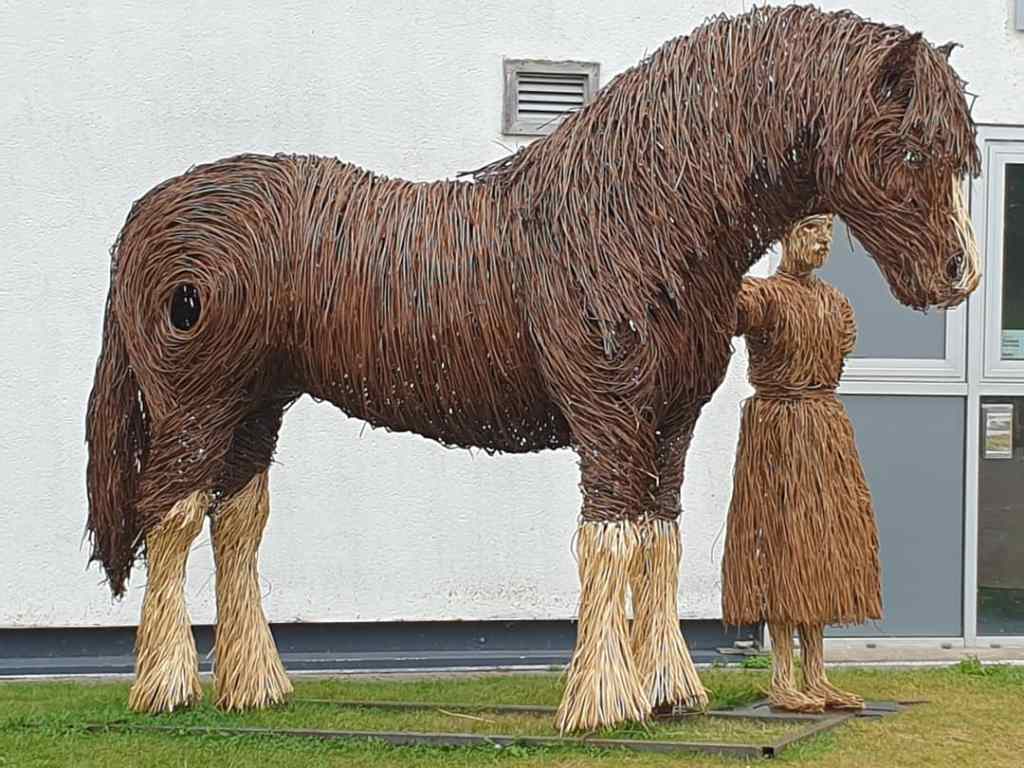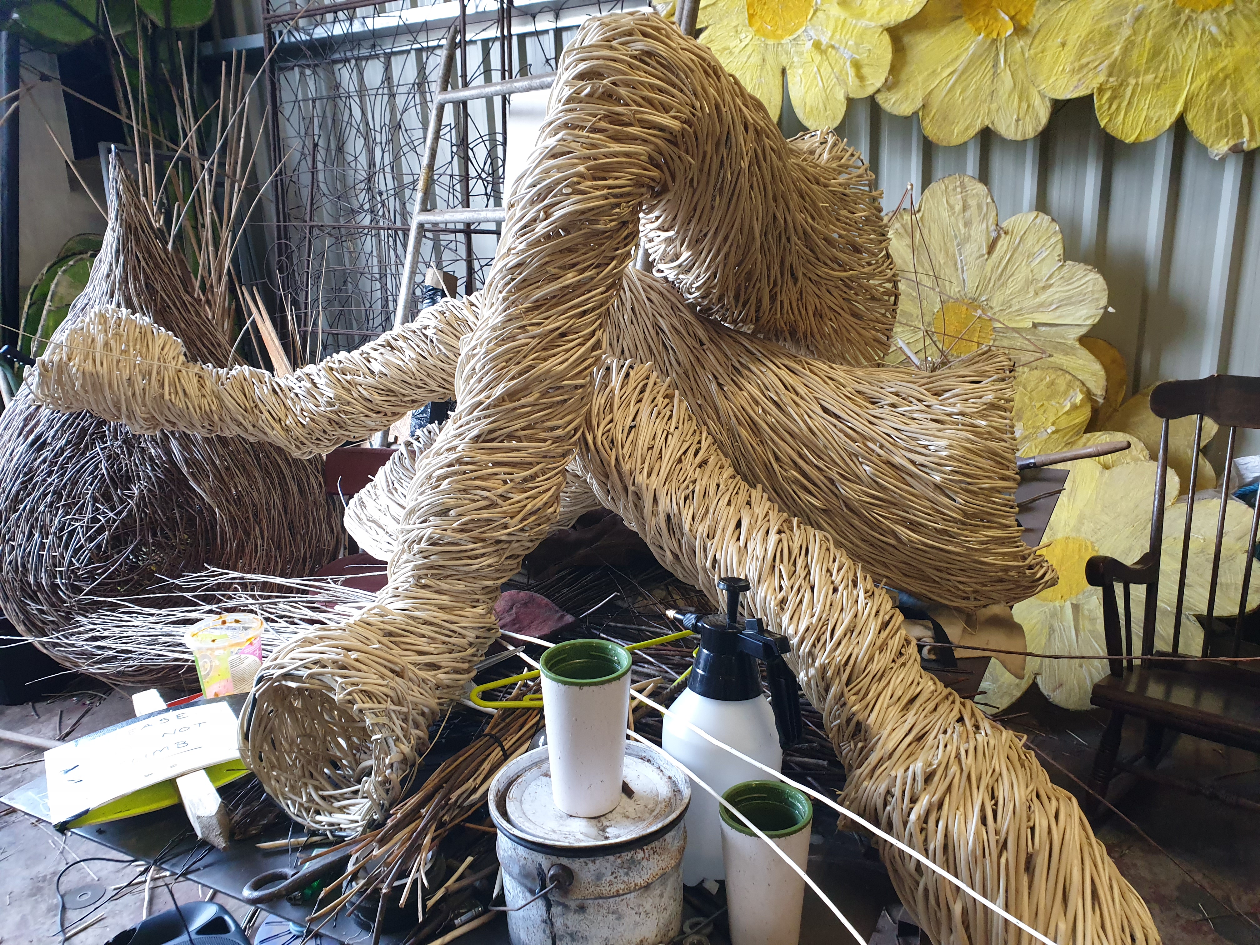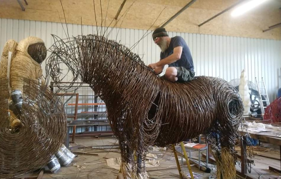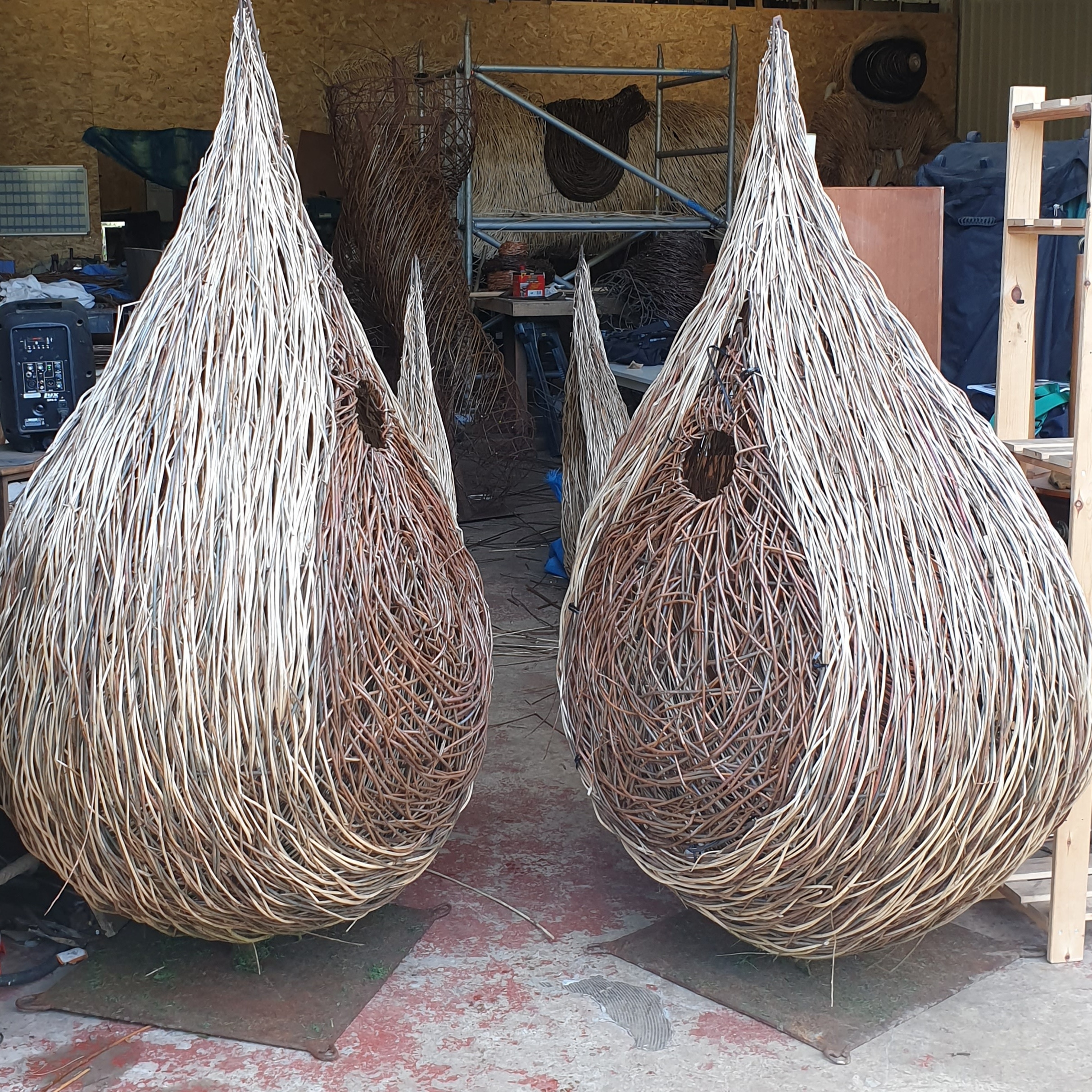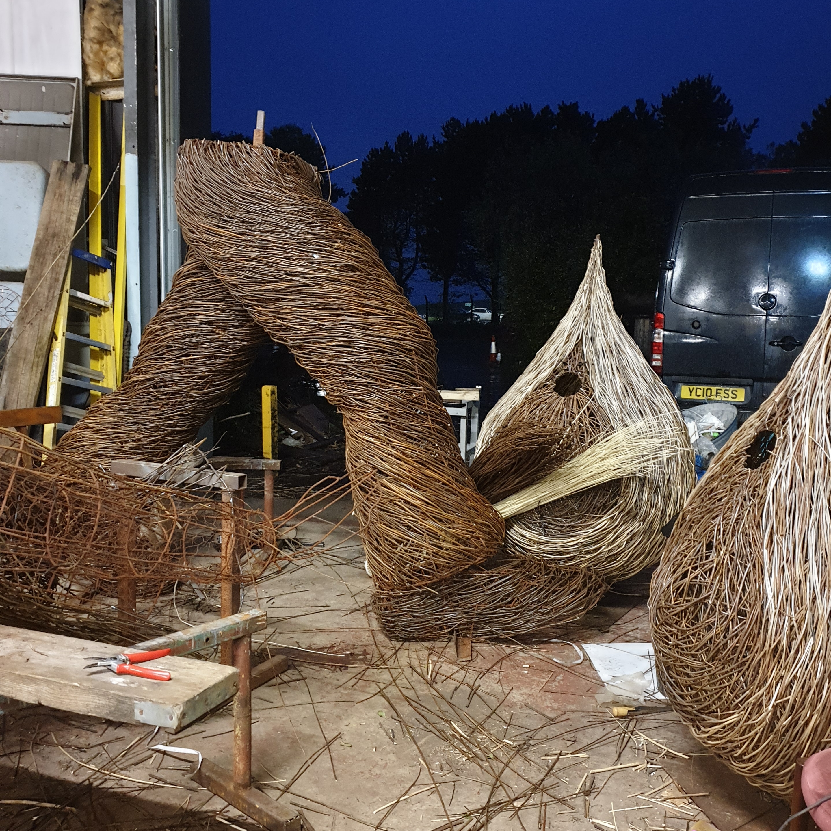 In, out and roundabout. Legs in the weave for the Poet Walking commissioned by the National Trust for Scotland destined for Alloway along with Tam and his trusty steed Meg. Two pieces on the go, 11 sections in all. And the water drops back to play with?
