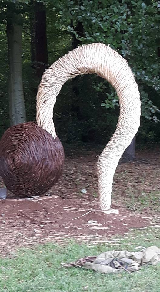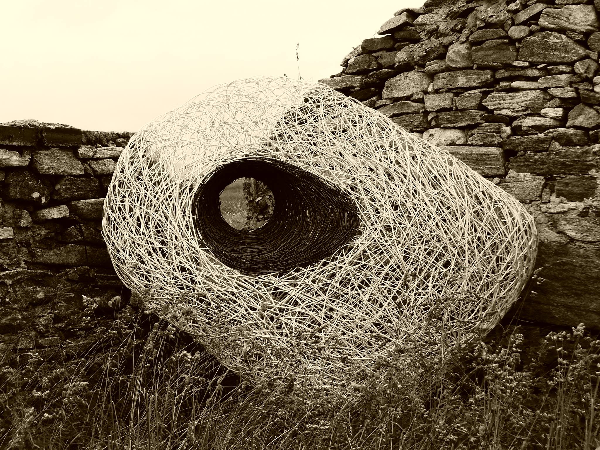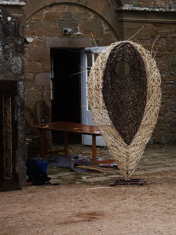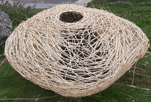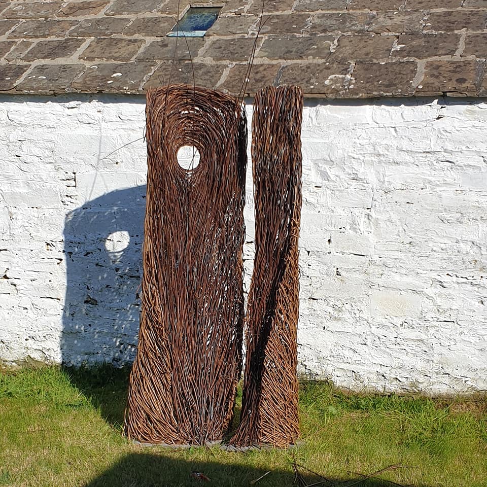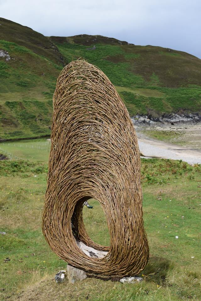 Sculpture forms with inspiration drawn from the land, from stone querns to insect cocoons. Works in willow, steel and stone, fire and water.