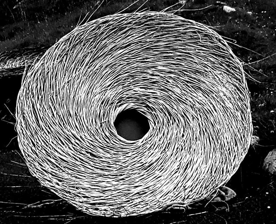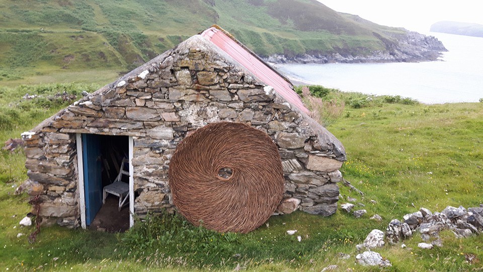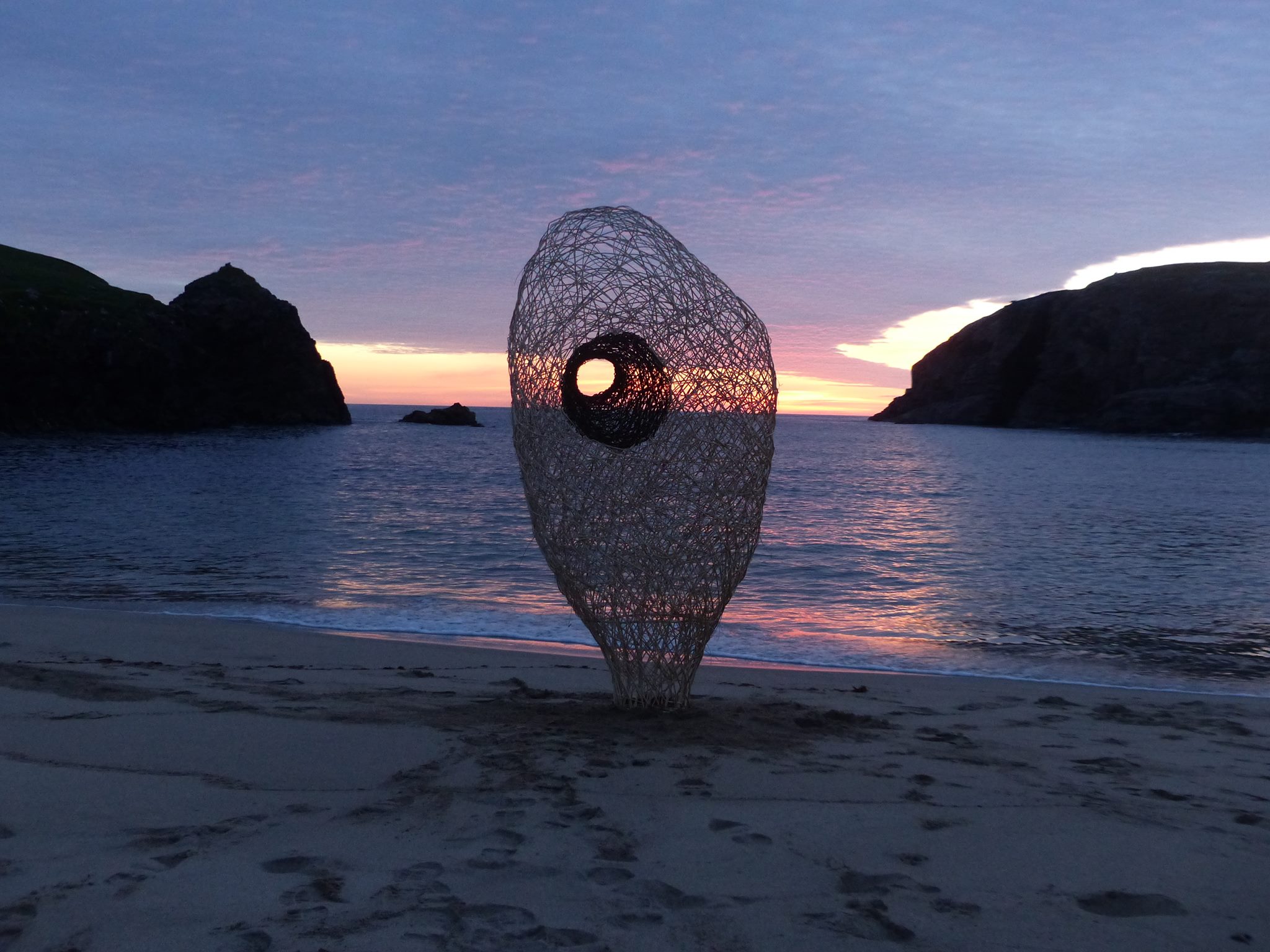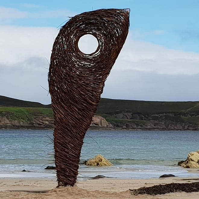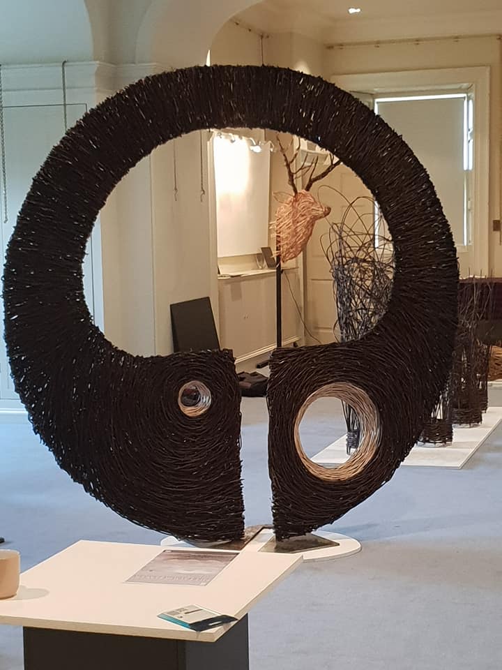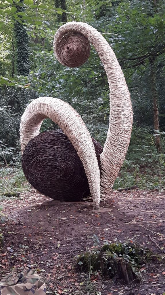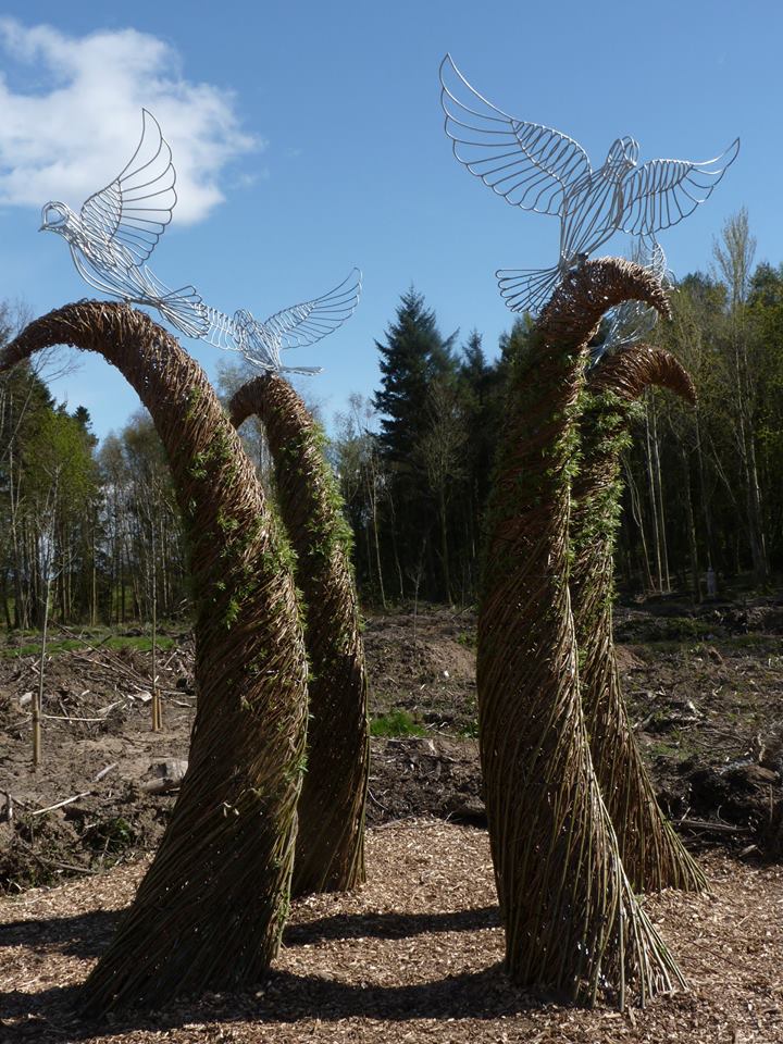 Sculpture forms with inspiration drawn from the land, from stone querns to insect cocoons. Works in willow, steel and stone, fire and water.
